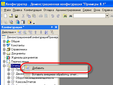 Для создания отчета выберем в дереве конфигурации ветвь "Отчеты" и вызовем контекстное меню. В появившемся контекстном меню выберем команду "Добавить".