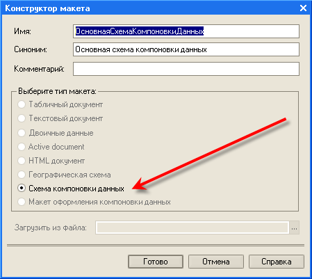 Отметим, что схема компоновки данных, с точки зрения конфигурации, является макетом, поэтому система 1С:Предприятие 8 предлагает стандартный диалог конструктора макета. В этом диалоге по умолчанию выбран тип макета "Схема компоновки данных", а другие типы макетов недоступны для выбора.