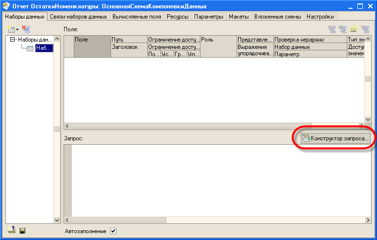 Теперь для этого набора данных нужно ввести текст запроса, с помощью которого будут получены данные. Текст запроса можно ввести с клавиатуры прямо в поле "Запрос", или воспользоваться конструктором запроса, который позволяет создавать и редактировать запросы визуальными средствами.