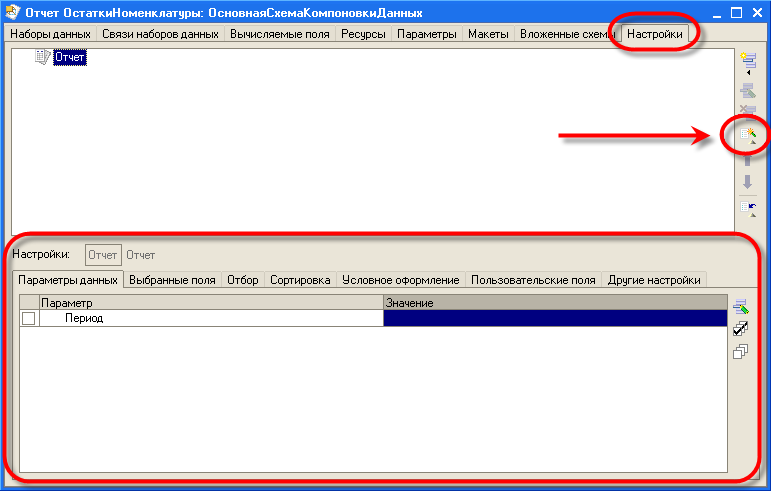 Созданные конструктором настройки система 1С:Предприятие 8 помещает в настройки схемы компоновки данных. Если в дальнейшем нам понадобится их изменить, мы сможем доработать их произвольным образом при помощи табличных полей или же снова воспользоваться конструктором.