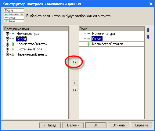 На следующем шаге предлагается выбрать поля, значения которых будут выведены в отчет. Для того, чтобы выбрать сразу все поля, нажмем кнопку ">>". Конструктор поместит все поля в список выбранных полей, расположенный в правой части.