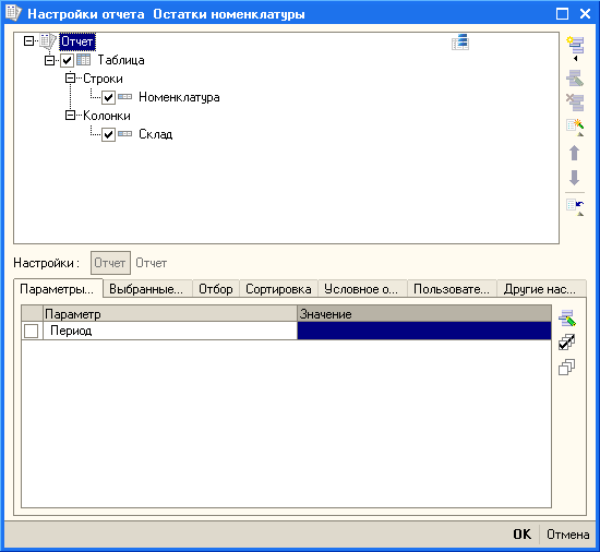 Форма же настроек в режиме 1С:Предприятие очень похожа на настройки из конструктора схемы компоновки данных: