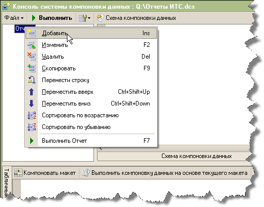 Для того, чтобы отлаживать схему в консоли компоновки данных нужно добавить схему в консоль. В консоли схемы компоновки данных располагаются в отчетах. Для создания нового отчета в консоли системы компоновки данных нужно в дереве отчетов воспользоваться командой "Добавить" и ввести имя отчета.