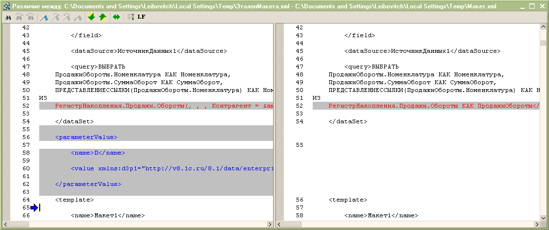 В консоли имеется возможность сохранить текст сгенерированного макета компоновки данных в качестве эталона (команда "Сохранить эталон") и сравнить с новым макетм, после изменения схемы компоновки данных или настроек (команда "Сравнить с эталоном"). Это дает возможность понять, что меняется в зависимости от того или иного изменения в настройках или схеме компоновки данных.
