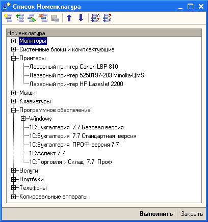 Добавление строк в дерево значений происходит в процедуре "ЗаполнитьУзел". В начале данной процедуры определяется коллекция строк дерева значений, в которую будут добавляться подчиненные строки. Если параметр "Строка" имеет значение Неопределено, то будут добавляться строки верхнего уровня, иначе добавляются строки, подчиненные строке, переданной в качестве параметра. Далее формируется запрос к справочнику "Номенклатура" для получения элементов справочника и получается выборка. В качестве параметра данного запроса передается ссылка на родительскую строку или пустая ссылка, если добавляются строки верхнего уровня. Затем полученная выборка обходится и в дерево значений добавляются новые строки. Если добавленная строка является группой справочника, то добавляется еще одна строка, подчиненная добавленной строке. Эта строка является фиктивной и необходима для того, чтобы в табличном поле отображалась пиктограмма раскрытия строки.