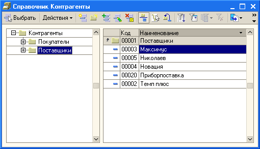 В результате в форме выбора контрагентов будут отображаться только поставщики.