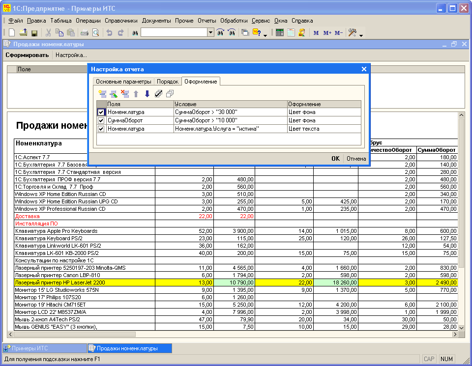 Пример использования условного оформления можно найти в демонстрационной конфигурации "Примеры ИТС", в отчете "ПродажиНоменклатуры". В данном отчете выводится отчет о продажах номенклатуры контрагентам. В отчете, при помощи условного оформления, зеленым фоном выделяются суммы, если их значения превышали 10000, желтым фоном выделяются строки номенклатуры, если объем продаж по данной номенклатуре превысил 30000, красным текстом в отчете выделяются строки, содержащие услуги.