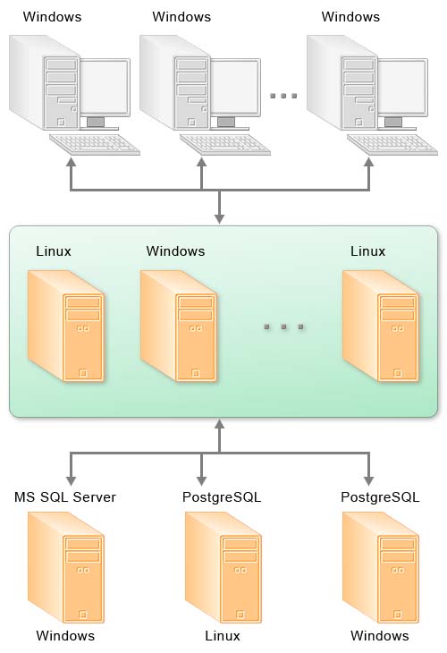 Компьютеры, входящие в состав кластера серверов, могут работать под управлением операционных систем Windows или Linux. Допускается включение в состав одного кластера рабочих серверов, функционирующих под разными операционными системами.