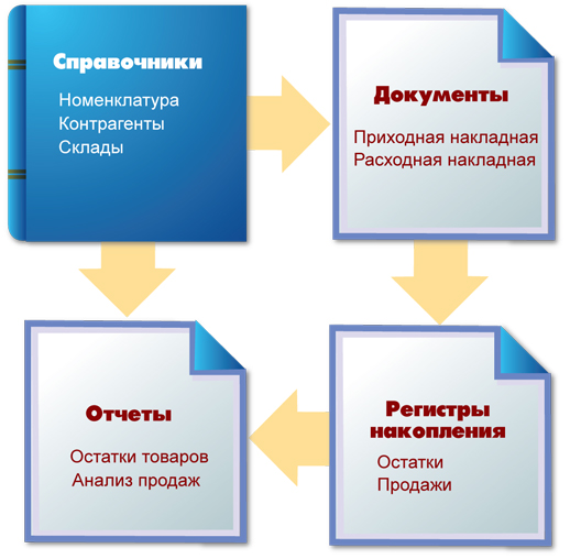 Структура прикладного решения в конфигураторе создается визуальными средствами (буквально мышкой!). Разработчик создает различные объекты и настраивает их взаимосвязи друг с другом. С помощью визуальных редакторов создаются таблицы, экранные формы, макеты отчетов и печатных форм документов. Встроенный язык используется для описания различных алгоритмов, например, расчета налогов, исчисления себестоимости, алгоритмов проведения документов и формирования отчетов.
