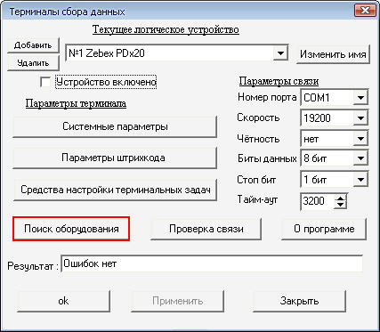 Нажать кнопку "Поиск оборудования" с целью выяснить параметры соединения.