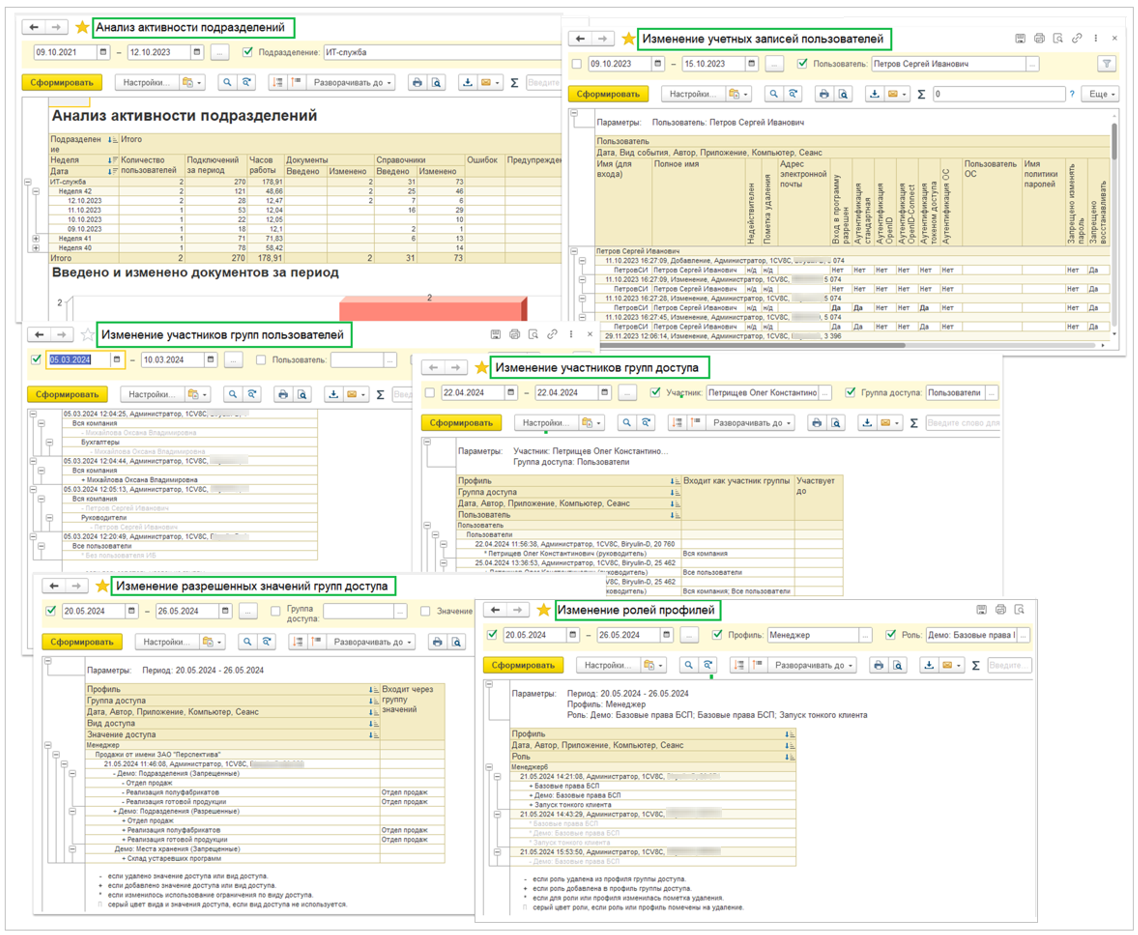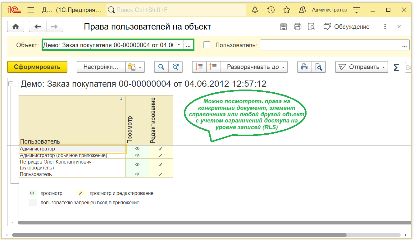 Яндекс.Диск, Google Drive и Интернет (http-сервис).Расширены возможности по анализу прав доступа пользователей к документам и справочникам приложения с учетом ограничений доступа на уровне записей (RLS). Для этого в списках, карточках документов, элементах справочников доступны два контекстных отчета, которые можно найти в меню Еще - Отчеты: