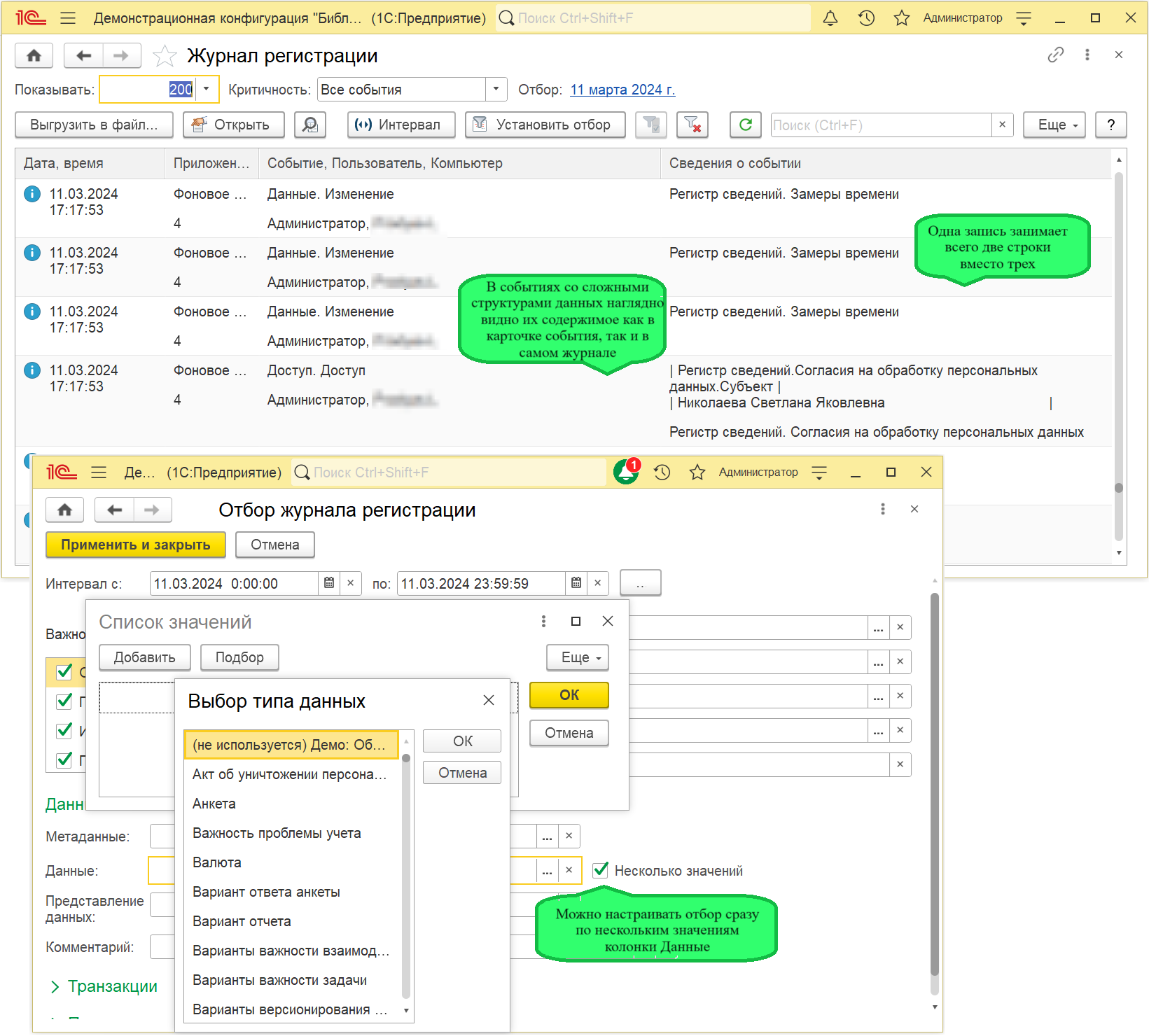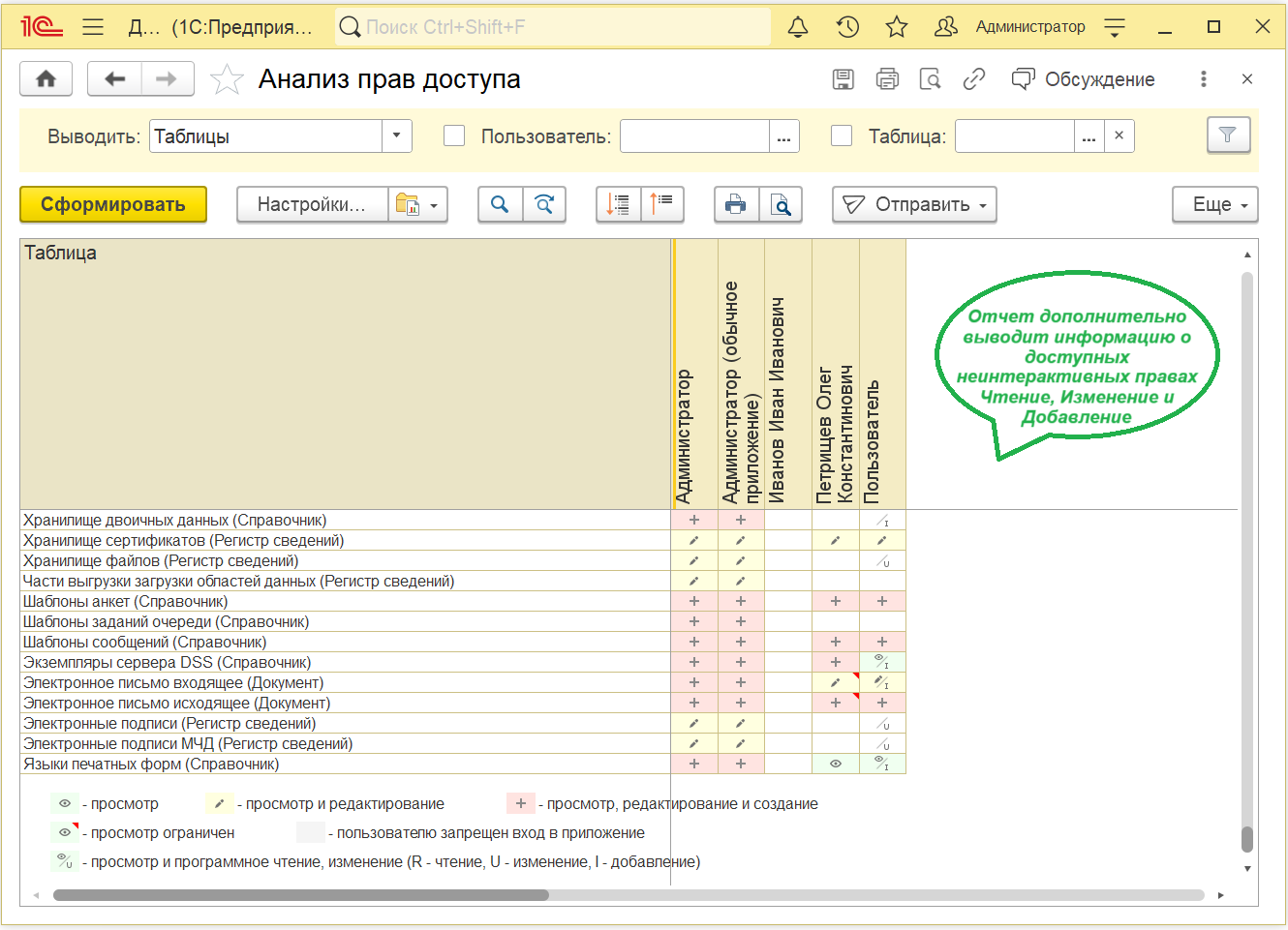 Теперь отчет Анализ прав доступа дополнительно выводит информацию о доступных неинтерактивных правах Чтение, Изменение и Добавление, с помощью которых можно получить доступ к данным неявным образом: программно с помощью расширений, внешних отчетов и обработок, через консоль запросов и т.п. Эти уточнения выводятся в тех случаях, когда в ролях выключены соответствующие интерактивные права Просмотр, Редактирование и Интерактивное добавление. К отчету можно перейти из раздела Администрирование - Отчеты администратора.