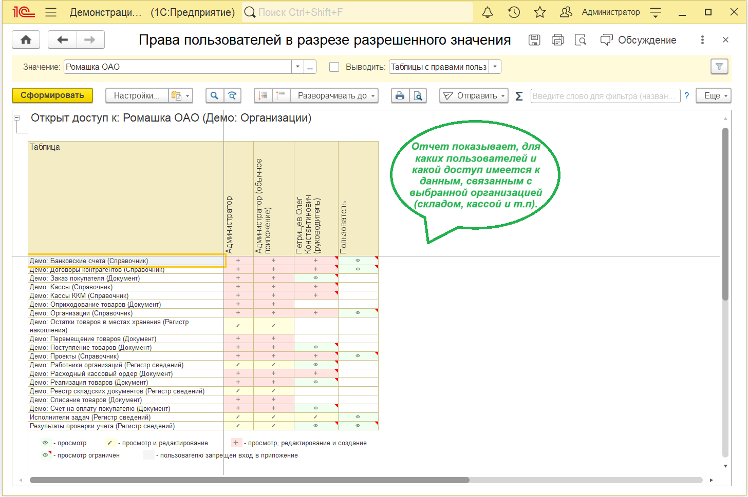 Для удобства из отчета Анализ прав доступа с помощью расшифровки по таблице можно открывать отчет Права ролей. Варианты расшифровки конкретного поля в отчете теперь видны в контекстном меню по правой кнопке мыши.