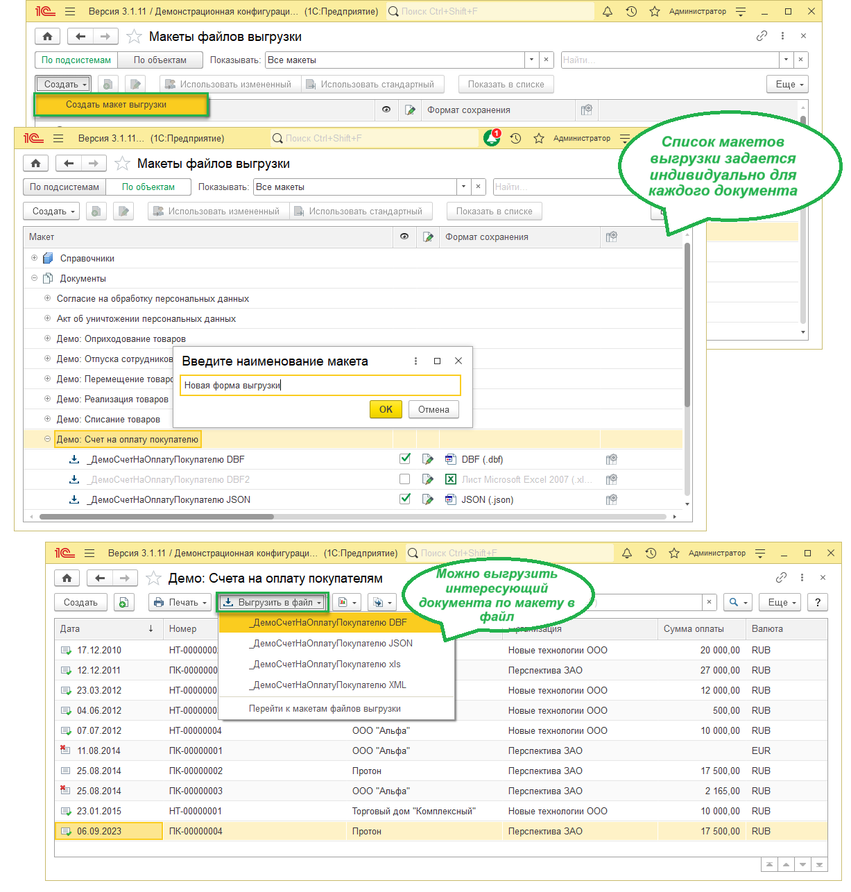 В состав библиотеки включена новая подсистема Выгрузка объектов в файлы, которая используется совместно с подсистемой Печать. Она позволяет выгружать произвольные документы, справочники и другие объекты приложения в файлы различных форматов по настраиваемым макетам. Список макетов выгрузки задается индивидуально для каждого документа в разделе Администрирование - Печатные формы, отчеты и обработки - Макеты файлов выгрузки. В макет можно включить любое поле или табличную часть в нужном порядке, указать формат выходного файла: DBF, XML, JSON, HTML, TXT, XLS, XLSX или MXL. Для выгрузки интересующего документа по макету в файл можно воспользоваться подменю Выгрузить в файл в карточке этого документа, а также в списках и журналах документов. Также можно прикрепить сформированный файл прямо к самому документу, если у него предусмотрены присоединенные файлы, или настроить шаблоны сообщений для рассылки с требуемыми макетами выгрузки. Пример настройки макетов выгрузки см. в демонстрационной базе для документа _ДемоСчетНаОплатуПокупателю.