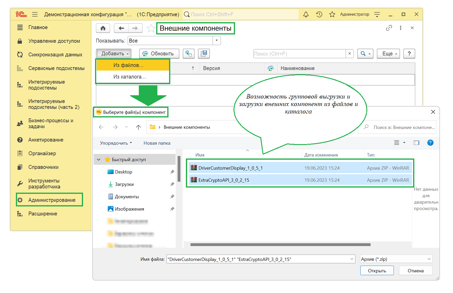 СнимкиОтчетов. См. примеры его использования в общем модуле _ДемоОбменМобильныйКлиент.ВариантыОтчетовПереопределяемый.ПередДобавлениемКомандОтчетов при определении команд отчетов, можно установить свойство Неконтекстный. Если Истина, то будут доступны для выбора другие варианты этого отчета, возможность добавления в избранное, получение ссылки на вариант отчета. Значение по умолчанию: Ложь.ПодключитьКомпонентуИзМакета и функция ПодключитьКомпонентуИзМакетаАсинх общего модуля ОбщегоНазначенияКлиент теперь возвращают символическое имя и местоположение, из которого была подключена компонента: имя макета или навигационную ссылку на внешнюю компоненту из справочника, если ее версия выше. Используя символическое имя и местоположение, можно проверять подключение компоненты методом платформы ПроверитьПодключениеВнешнейКомпоненты.ПодключитьКомпонентуИзМакета и функции ПодключитьКомпонентуИзМакетаАсинх общего модуля ОбщегоНазначенияКлиент теперь необязательно показывать предложение об установке, а сразу начинать установку компоненты. Для этого в функции-конструкторе ПараметрыПодключенияКомпоненты этого же общего модуля предусмотрено свойство ПоказыватьВопросУстановки. Его рекомендуется указывать лишь в случаях, когда дополнительное информирование об установке компоненты избыточно (например, уже проинформировали ранее).ЗащитаПерсональныхДанных.УдалитьИнформациюОбУничтоженииПерсональныхДанных.ЗащитаПерсональныхДанных.СубъектыСИстекшимСрокомХранения можно получить субъекты с истекшим сроком хранения персональных данных.РаспознатьАдрес в процедуре ДобавитьКонтактнуюИнформацию общего модуля УправлениеКонтактнойИнформацией теперь можно отключать распознавание адреса по его представлению согласно адресному классификатору ГАР. В этом случае представление адреса, переданное в параметре ЗначениеИлиПредставление, будет записано в информационную базу без значения полей этого адреса. Это может быть востребовано, когда хранение полей адреса в информационной базе избыточно.УправлениеКонтактнойИнформацией предусмотрены функции СведенияОбАдресе и СведенияОбАдресах. Эти функции возвращают адрес в структурированном виде, что упрощает его использование при оформлении заказов, доставок и интеграции с внешними сервисами, требующими точного указания адреса.